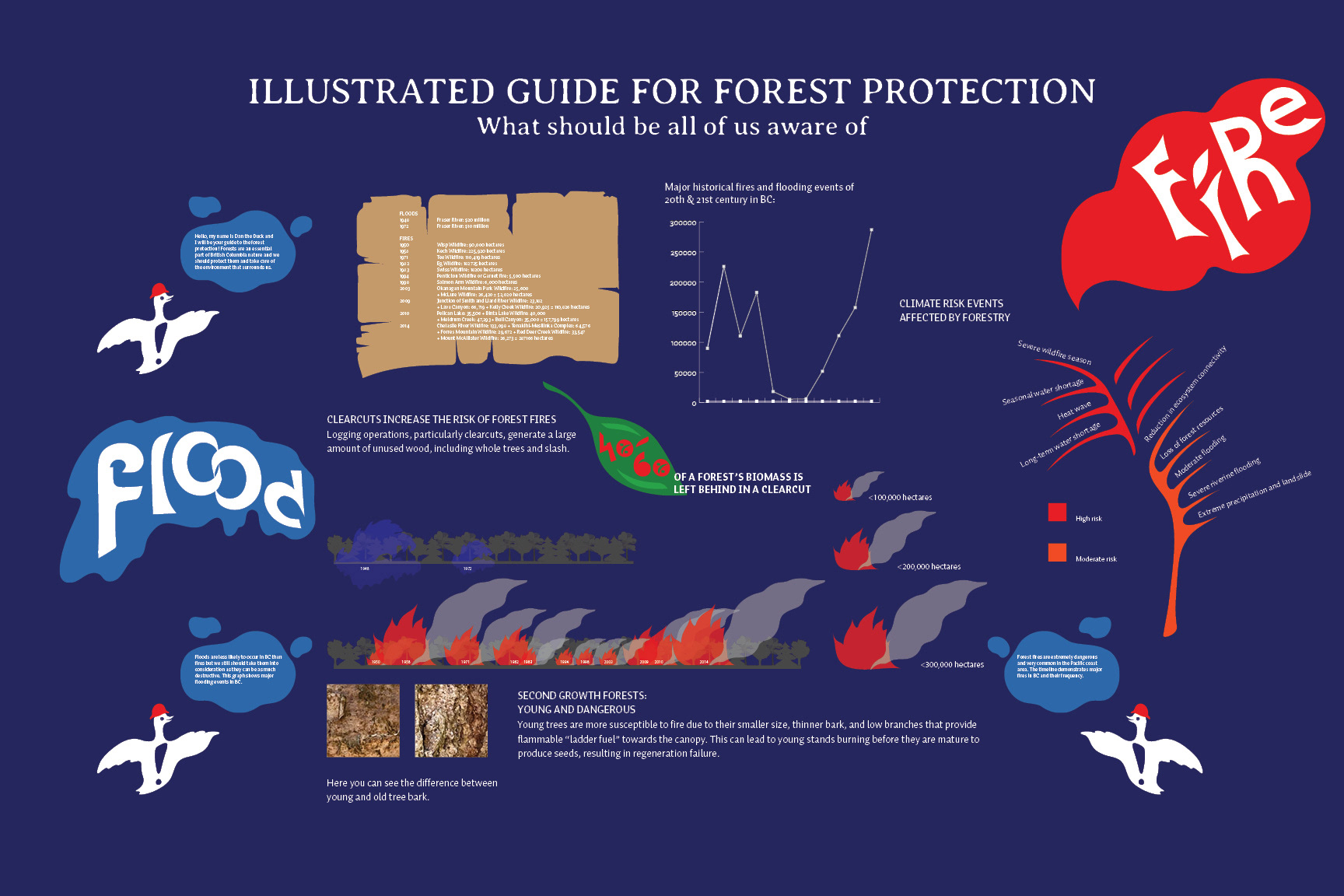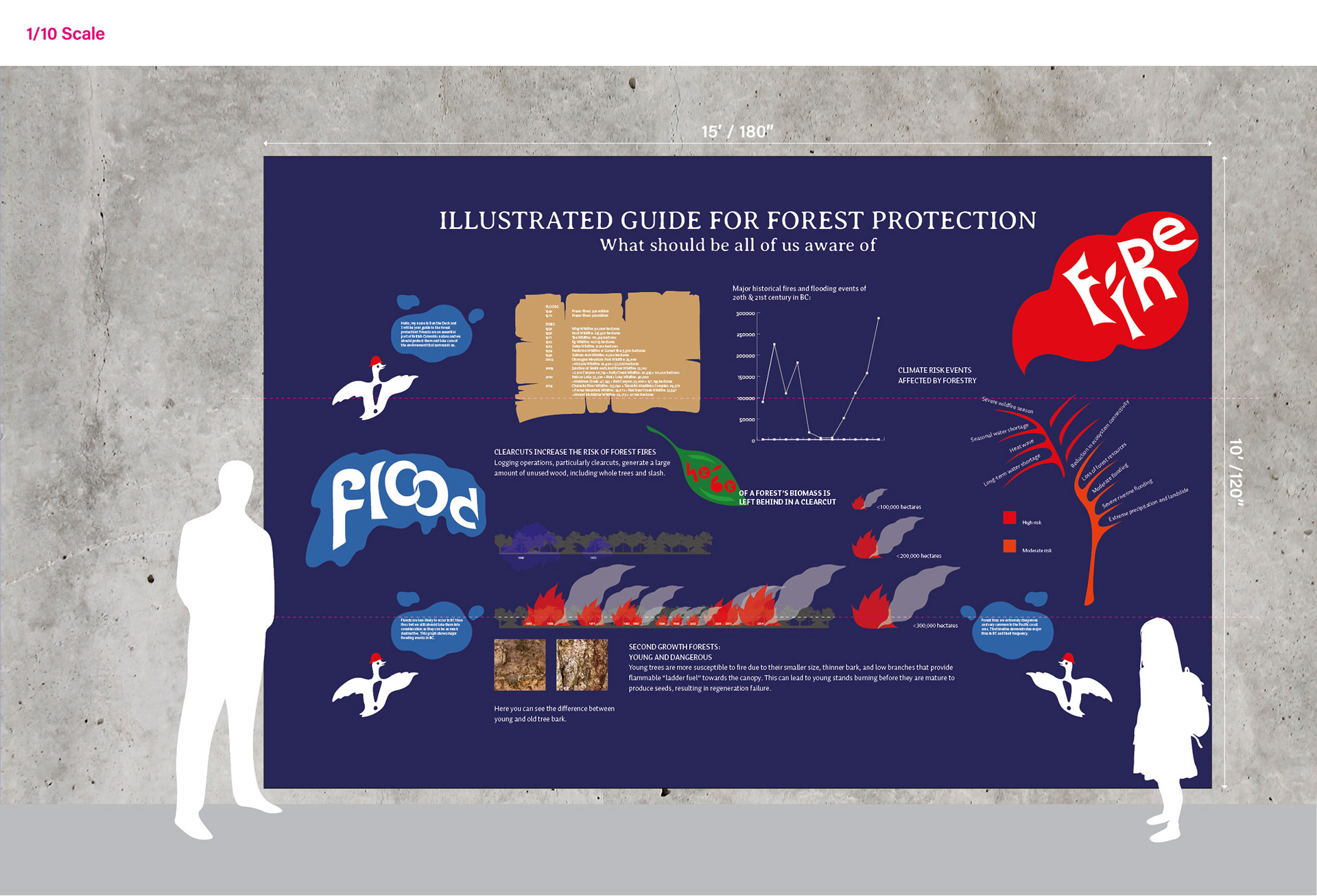 This information exhibit is created for both kids and their parents. Illustrated graphs are aimed to draw attention of children and precise graphs and written information are mainly created for the adults. More complicated graphs are placed higher while more colourful and illustrative are placed at lower eye levels to capture kids' attention. This separation helps each audience engage with the content in a way that feels natural and inviting. The idea which I am trying to transmit is very simple but highly important. We should take care of our nature and forests in particular. The first step is to learn what are the main threats and how to decrease and minimize them.