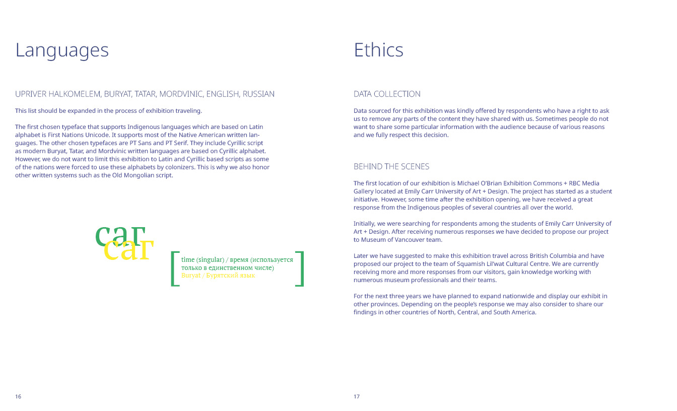 Key words: Indigenous knowledge; Oral history, Storytelling, Poetry, Time concept. The exhibition represents a wide range of First Nations’ poetry and personal stories. We think that these stories in the manner of a mosaic constitute unique Indigenous cultures all over the world. This exhibit is a compilation of stories that demonstrate connection between people and communities they belong to. Each of these stories carries unique identity, life experience and represents certain community. We believe that Indigenous knowledge should be passed by people in the first place but not the historians or anthropologists. This is why we asked people to share their personal stories and unique life experiences. The knowledge hidden in their narrations leads this exhibit.